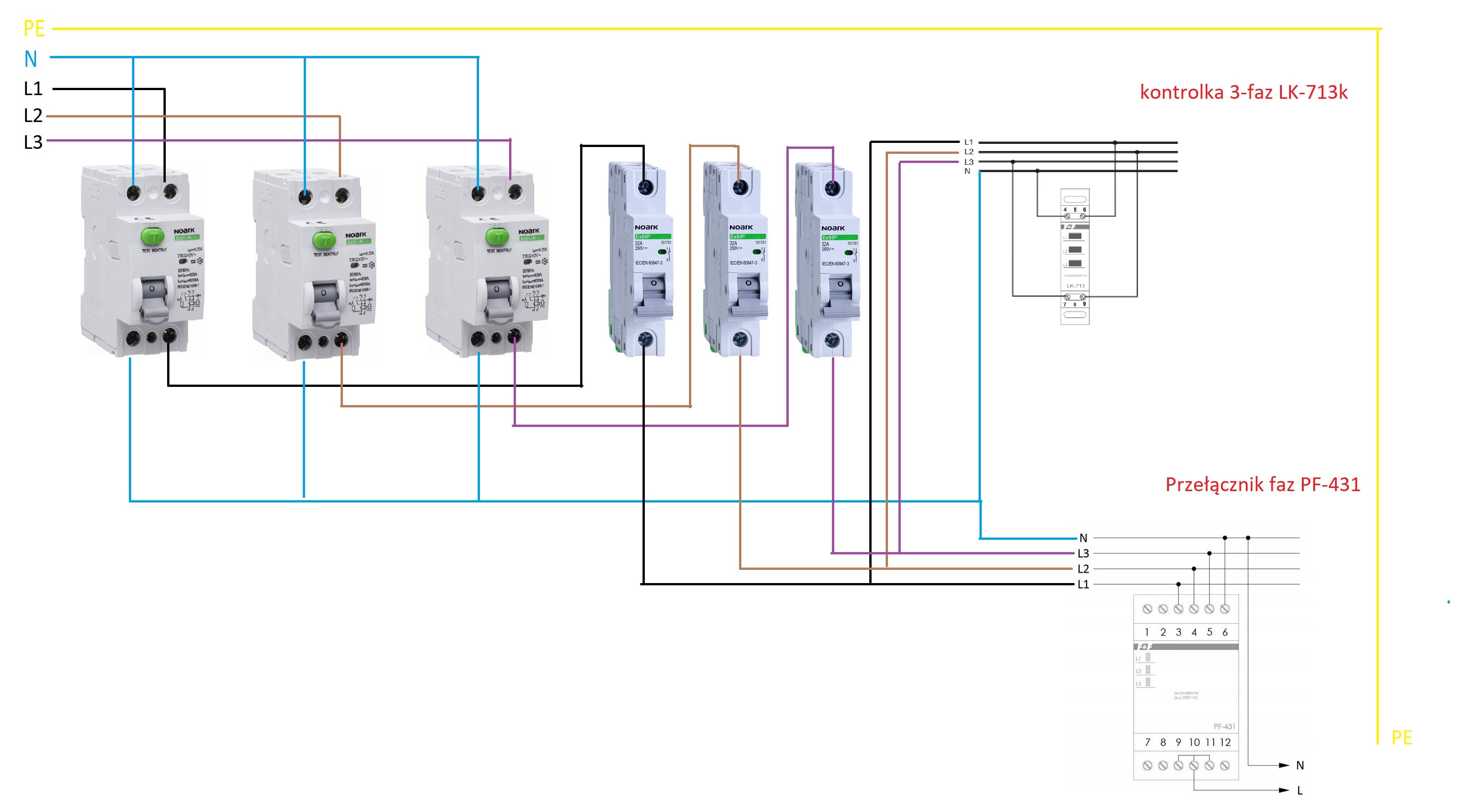 W obwodzie mam zamiar wykorzystać wyłącznik różnicowoprądowy odzienie dla każdej fazy aby w przypadku gdy zadziała jeden wyłącznik to pozostałe zostały włączone.