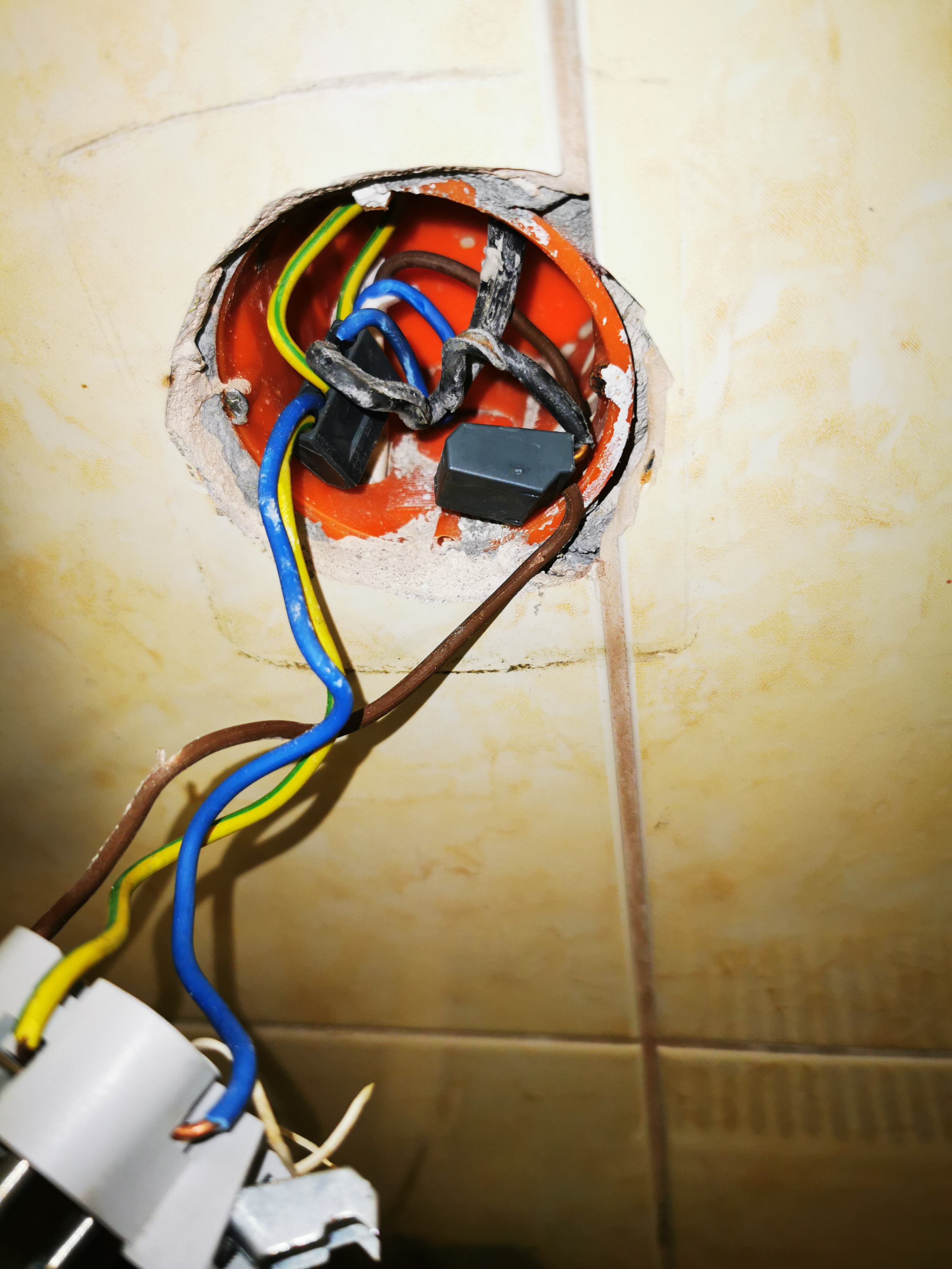 Jeżeli instalacja w domu jest TNC, czyli dwużyłowa, to należy zmostkować przewód PEN (najczęściej niebieski) na "bolec". Rozwiązanie z załączonych zdjęć jest nie prawidłowe. Nie należy rozdzielać przewodu PEN na N i PE za pomocą złączek. Zasada jest taka, że należy przewód PEN podłączyć do zacisku "bolca" a następnie z zacisku "bolca" do zacisku N gniazda (nie odwrotnie!).