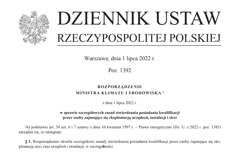 Poz. 1392 ROZPORZĄDZENIE MINISTRA KLIMATU I ŚRODOWISKA z dnia 1 lipca 2022 r. w sprawie szczegółowych zasad stwierdzania posiadania kwalifikacji przez osoby zajmujące się eksploatacją urządzeń, instalacji i sieci.